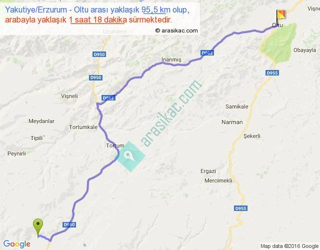Yakutiye Erzurum - Oltu arası yaklaşık olarak 90 km/h ile yukarıda belirtilen sürede olup, iki yerin kuş uçuşu uzaklığı (mesafesi) 74'dir. Yolculuk otobüsle 1 saat 41 dakika sürmektedir.