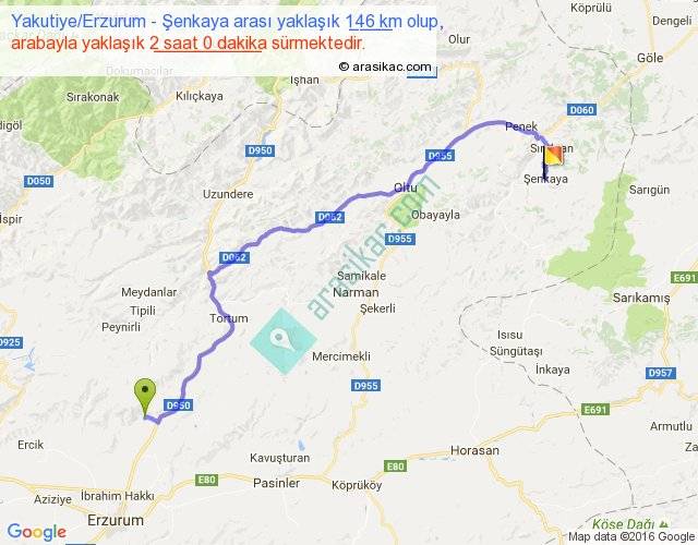 Yakutiye Erzurum - Şenkaya arası yaklaşık olarak 90 km/h ile yukarıda belirtilen sürede olup, iki yerin kuş uçuşu uzaklığı (mesafesi) 99'dir. Yolculuk otobüsle 2 saat 36 dakika sürmektedir.