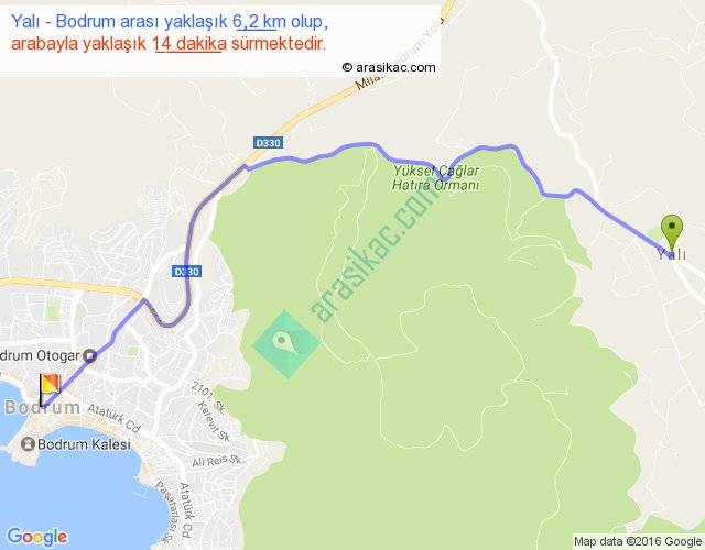 Yalı - Bodrum arası yaklaşık olarak 90 km/h ile yukarıda belirtilen sürede olup, iki yerin kuş uçuşu uzaklığı (mesafesi) 4'dir. Yolculuk otobüsle 18 dakika sürmektedir.