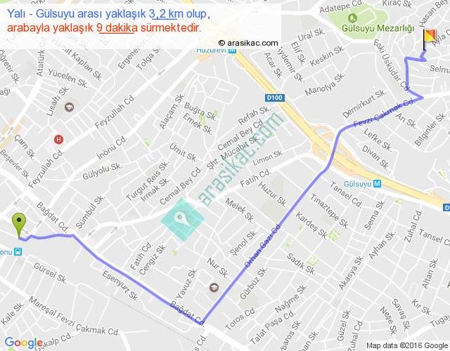 Yalı - Gülsuyu arası yaklaşık olarak 90 km/h ile yukarıda belirtilen sürede olup, iki yerin kuş uçuşu uzaklığı (mesafesi) 2'dir. Yolculuk otobüsle 11 dakika sürmektedir.