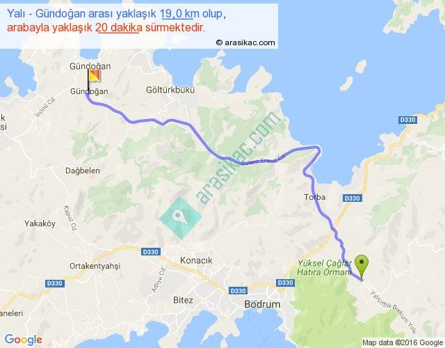 Yalı - Gündoğan arası yaklaşık olarak 90 km/h ile yukarıda belirtilen sürede olup, iki yerin kuş uçuşu uzaklığı (mesafesi) 14'dir. Yolculuk otobüsle 26 dakika sürmektedir.