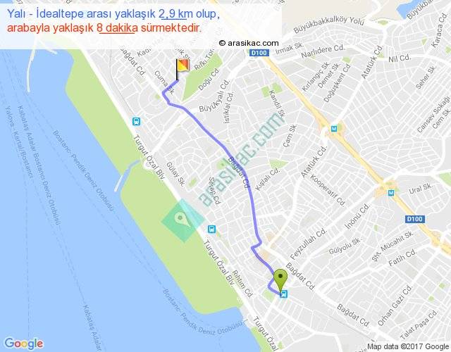 Yalı - İdealtepe arası yaklaşık olarak 90 km/h ile yukarıda belirtilen sürede olup, iki yerin kuş uçuşu uzaklığı (mesafesi) 2'dir. Yolculuk otobüsle 10 dakika sürmektedir.