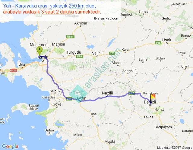 Yalı - Karşıyaka arası yaklaşık olarak 90 km/h ile yukarıda belirtilen sürede olup, iki yerin kuş uçuşu uzaklığı (mesafesi) 191'dir. Yolculuk otobüsle 3 saat 56 dakika sürmektedir.