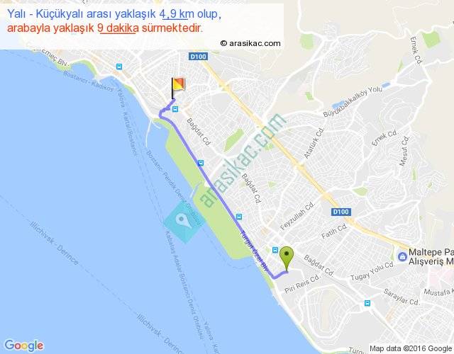 Yalı - Küçükyalı arası yaklaşık olarak 90 km/h ile yukarıda belirtilen sürede olup, iki yerin kuş uçuşu uzaklığı (mesafesi) 4'dir. Yolculuk otobüsle 11 dakika sürmektedir.