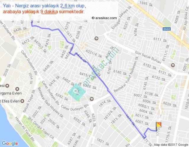 Yalı - Nergiz arası yaklaşık olarak 90 km/h ile yukarıda belirtilen sürede olup, iki yerin kuş uçuşu uzaklığı (mesafesi) 2'dir. Yolculuk otobüsle 11 dakika sürmektedir.