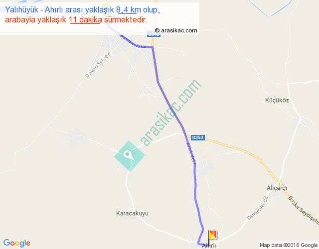 Yalıhüyük - Ahırlı arası yaklaşık olarak 90 km/h ile yukarıda belirtilen sürede olup, iki yerin kuş uçuşu uzaklığı (mesafesi) 7'dir. Yolculuk otobüsle 14 dakika sürmektedir.