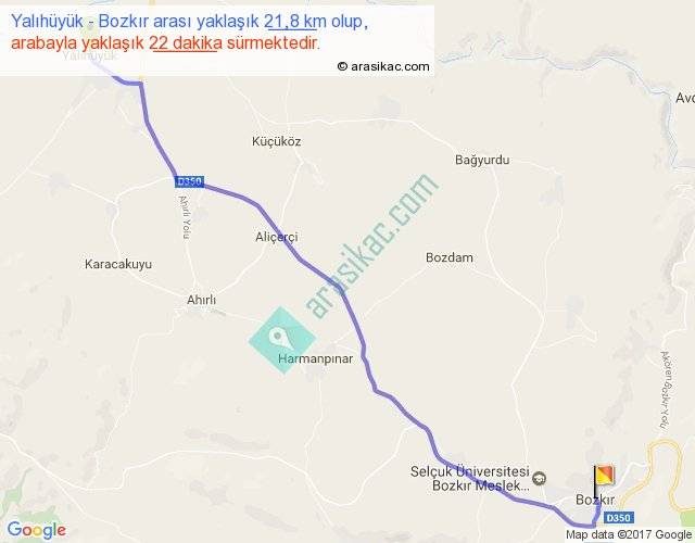 Yalıhüyük - Bozkır arası yaklaşık olarak 90 km/h ile yukarıda belirtilen sürede olup, iki yerin kuş uçuşu uzaklığı (mesafesi) 19'dir. Yolculuk otobüsle 27 dakika sürmektedir.