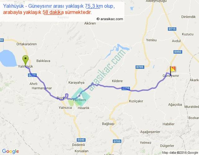 Yalıhüyük - Güneysınır arası yaklaşık olarak 90 km/h ile yukarıda belirtilen sürede olup, iki yerin kuş uçuşu uzaklığı (mesafesi) 57'dir. Yolculuk otobüsle 1 saat 15 dakika sürmektedir.