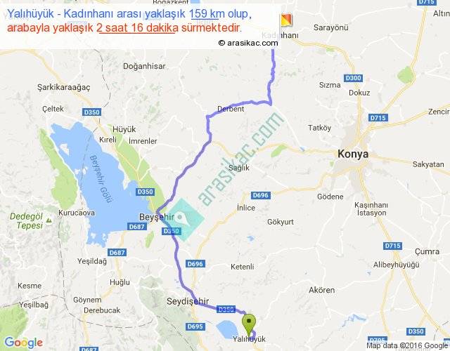 Yalıhüyük - Kadınhanı arası yaklaşık olarak 90 km/h ile yukarıda belirtilen sürede olup, iki yerin kuş uçuşu uzaklığı (mesafesi) 104'dir. Yolculuk otobüsle 2 saat 56 dakika sürmektedir.