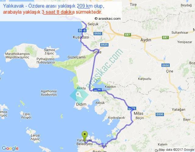 Yalıkavak - Özdere arası yaklaşık olarak 90 km/h ile yukarıda belirtilen sürede olup, iki yerin kuş uçuşu uzaklığı (mesafesi) 102'dir. Yolculuk otobüsle 4 saat 4 dakika sürmektedir.