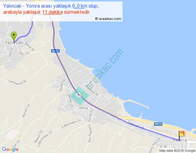 Yalıncak - Yomra arası yaklaşık olarak 90 km/h ile yukarıda belirtilen sürede olup, iki yerin kuş uçuşu uzaklığı (mesafesi) 4'dir. Yolculuk otobüsle 14 dakika sürmektedir.