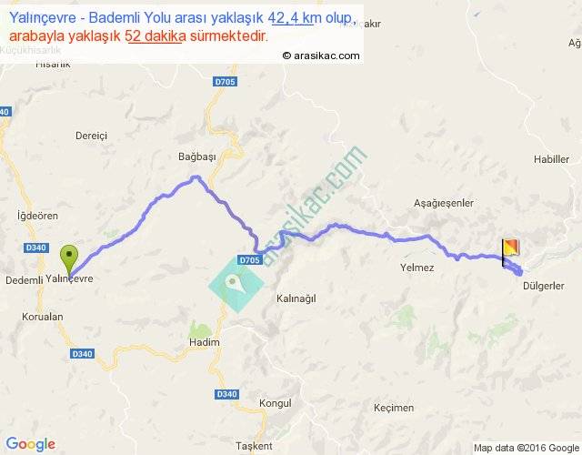 Yalınçevre - Bademli Yolu arası yaklaşık olarak 90 km/h ile yukarıda belirtilen sürede olup, iki yerin kuş uçuşu uzaklığı (mesafesi) 29'dir. Yolculuk otobüsle 1 saat 7 dakika sürmektedir.