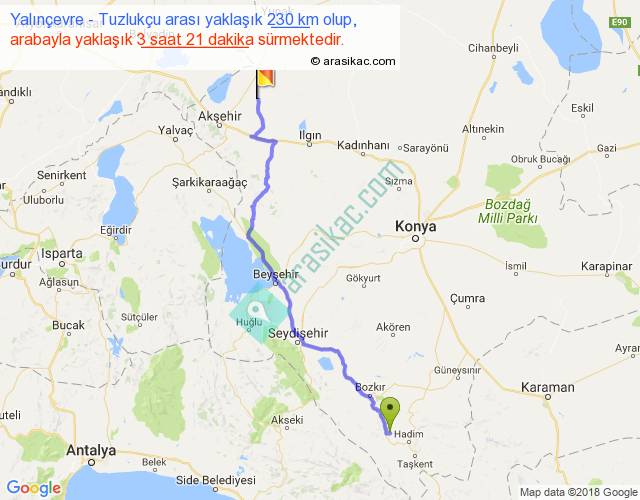 Yalınçevre - Tuzlukçu arası yaklaşık olarak 90 km/h ile yukarıda belirtilen sürede olup, iki yerin kuş uçuşu uzaklığı (mesafesi) 172'dir. Yolculuk otobüsle 4 saat 21 dakika sürmektedir.