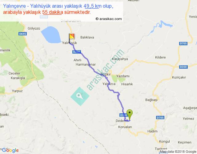 Yalınçevre - Yalıhüyük arası yaklaşık olarak 90 km/h ile yukarıda belirtilen sürede olup, iki yerin kuş uçuşu uzaklığı (mesafesi) 39'dir. Yolculuk otobüsle 1 saat 11 dakika sürmektedir.