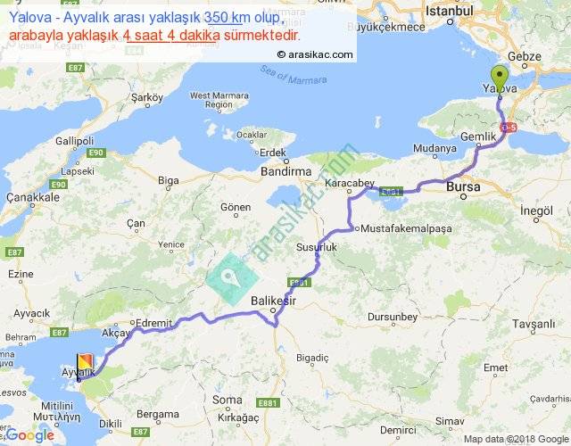 Yalova - Ayvalık arası yaklaşık olarak 90 km/h ile yukarıda belirtilen sürede olup, iki yerin kuş uçuşu uzaklığı (mesafesi) 265'dir. Eğer belirtilen yerler arasında uçak seferi var ise bu süre uçakla 24 dakika'ya kadar düşebilir. Yolculuk otobüsle 5 saat 22 dakika sürmektedir.