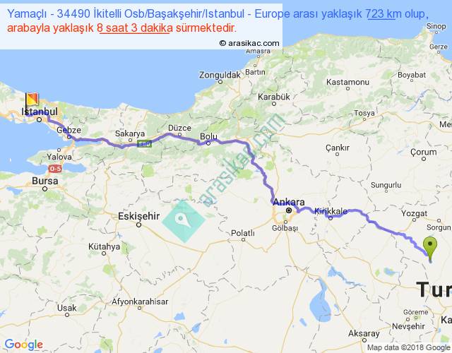 Yamaçlı - 34490 İkitelli Osb Başakşehir Istanbul - Europe arası yaklaşık olarak 90 km/h ile yukarıda belirtilen sürede olup, iki yerin kuş uçuşu uzaklığı (mesafesi) 564'dir. Eğer belirtilen yerler arasında uçak seferi var ise bu süre uçakla 52 dakika'ya kadar düşebilir. Yolculuk otobüsle 10 saat 27 dakika sürmektedir.