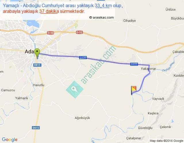 Yamaçlı - Abdioğlu Cumhuriyet arası yaklaşık olarak 90 km/h ile yukarıda belirtilen sürede olup, iki yerin kuş uçuşu uzaklığı (mesafesi) 21'dir. Yolculuk otobüsle 48 dakika sürmektedir.