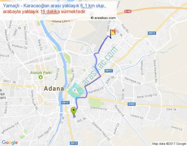 Yamaçlı - Karacaoğlan arası yaklaşık olarak 90 km/h ile yukarıda belirtilen sürede olup, iki yerin kuş uçuşu uzaklığı (mesafesi) 5'dir. Yolculuk otobüsle 20 dakika sürmektedir.