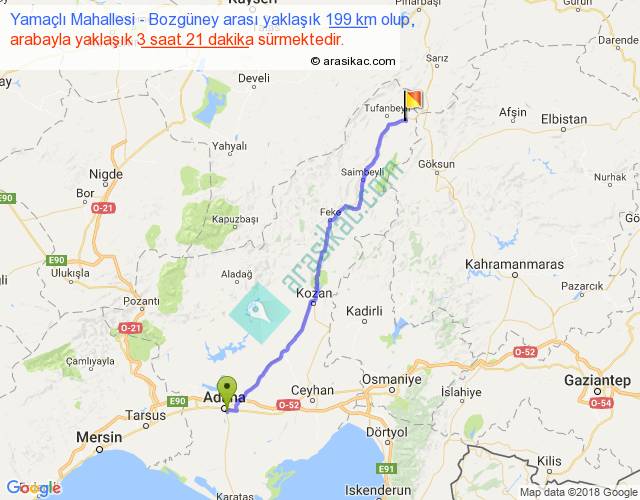 Yamaçlı Mahallesi - Bozgüney arası yaklaşık olarak 90 km/h ile yukarıda belirtilen sürede olup, iki yerin kuş uçuşu uzaklığı (mesafesi) 164'dir. Yolculuk otobüsle 4 saat 21 dakika sürmektedir.