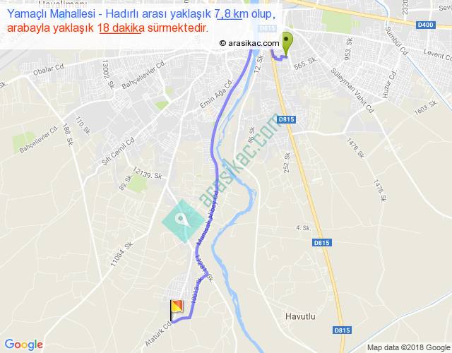 Yamaçlı Mahallesi - Hadırlı arası yaklaşık olarak 90 km/h ile yukarıda belirtilen sürede olup, iki yerin kuş uçuşu uzaklığı (mesafesi) 6'dir. Yolculuk otobüsle 23 dakika sürmektedir.