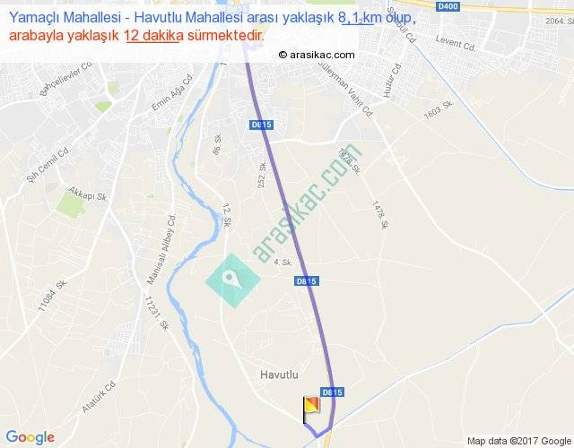 Yamaçlı Mahallesi - Havutlu Mahallesi arası yaklaşık olarak 90 km/h ile yukarıda belirtilen sürede olup, iki yerin kuş uçuşu uzaklığı (mesafesi) 6'dir. Yolculuk otobüsle 15 dakika sürmektedir.