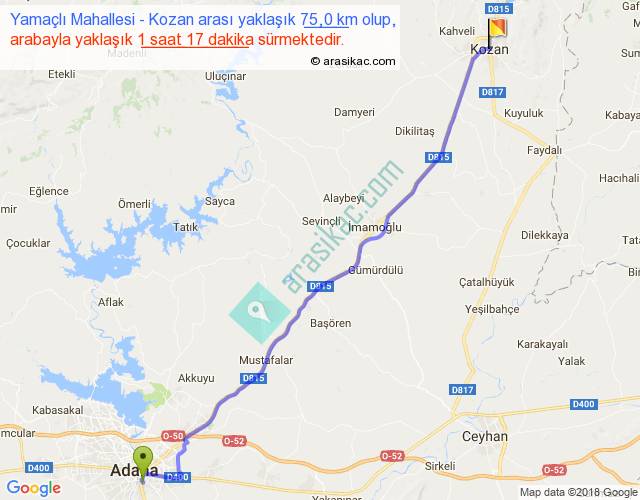 Yamaçlı Mahallesi - Kozan arası yaklaşık olarak 90 km/h ile yukarıda belirtilen sürede olup, iki yerin kuş uçuşu uzaklığı (mesafesi) 67'dir. Yolculuk otobüsle 1 saat 40 dakika sürmektedir.