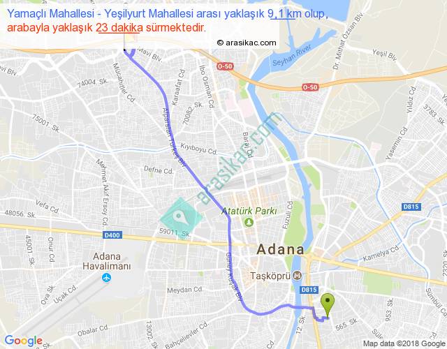 Yamaçlı Mahallesi - Yeşilyurt Mahallesi arası yaklaşık olarak 90 km/h ile yukarıda belirtilen sürede olup, iki yerin kuş uçuşu uzaklığı (mesafesi) 7'dir. Yolculuk otobüsle 29 dakika sürmektedir.