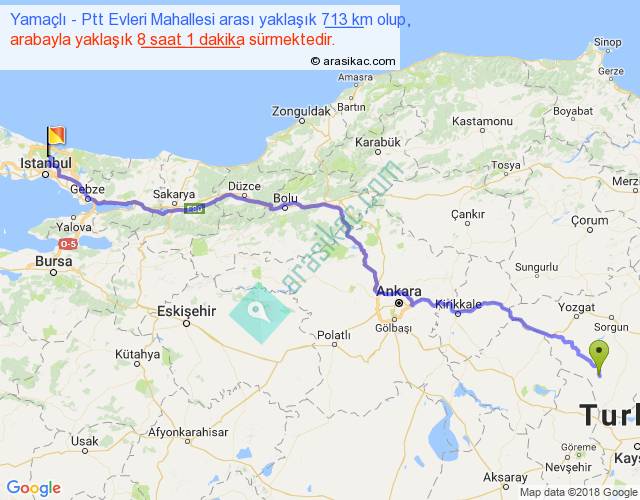 Yamaçlı - Ptt Evleri Mahallesi arası yaklaşık olarak 90 km/h ile yukarıda belirtilen sürede olup, iki yerin kuş uçuşu uzaklığı (mesafesi) 549'dir. Eğer belirtilen yerler arasında uçak seferi var ise bu süre uçakla 50 dakika'ya kadar düşebilir. Yolculuk otobüsle 10 saat 25 dakika sürmektedir.