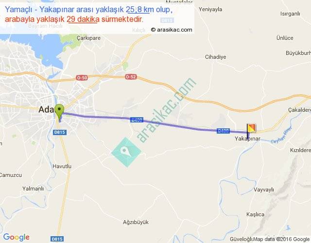 Yamaçlı - Yakapınar arası yaklaşık olarak 90 km/h ile yukarıda belirtilen sürede olup, iki yerin kuş uçuşu uzaklığı (mesafesi) 24'dir. Yolculuk otobüsle 37 dakika sürmektedir.
