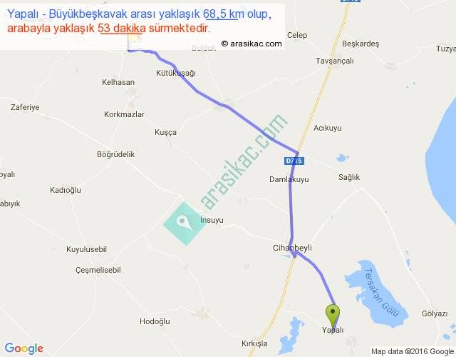 Yapalı - Büyükbeşkavak arası yaklaşık olarak 90 km/h ile yukarıda belirtilen sürede olup, iki yerin kuş uçuşu uzaklığı (mesafesi) 57'dir. Yolculuk otobüsle 1 saat 8 dakika sürmektedir.