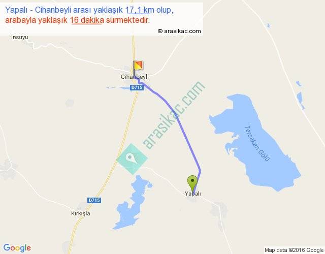 Yapalı - Cihanbeyli arası yaklaşık olarak 90 km/h ile yukarıda belirtilen sürede olup, iki yerin kuş uçuşu uzaklığı (mesafesi) 15'dir. Yolculuk otobüsle 20 dakika sürmektedir.