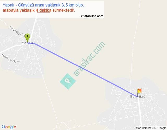 Yapalı - Günyüzü arası yaklaşık olarak 90 km/h ile yukarıda belirtilen sürede olup, iki yerin kuş uçuşu uzaklığı (mesafesi) 3'dir. Yolculuk otobüsle 5 dakika sürmektedir.