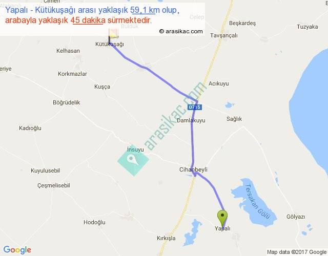 Yapalı - Kütükuşağı arası yaklaşık olarak 90 km/h ile yukarıda belirtilen sürede olup, iki yerin kuş uçuşu uzaklığı (mesafesi) 50'dir. Yolculuk otobüsle 58 dakika sürmektedir.