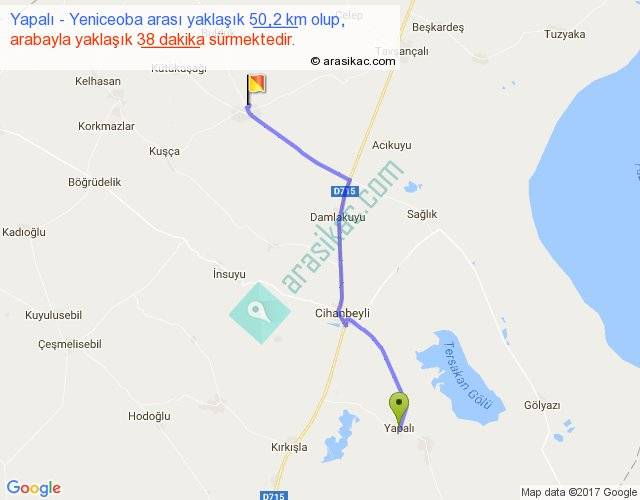 Yapalı - Yeniceoba arası yaklaşık olarak 90 km/h ile yukarıda belirtilen sürede olup, iki yerin kuş uçuşu uzaklığı (mesafesi) 42'dir. Yolculuk otobüsle 49 dakika sürmektedir.