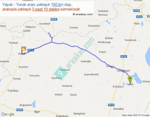 Yapalı - Yunak arası yaklaşık olarak 90 km/h ile yukarıda belirtilen sürede olup, iki yerin kuş uçuşu uzaklığı (mesafesi) 114'dir. Yolculuk otobüsle 2 saat 49 dakika sürmektedir.