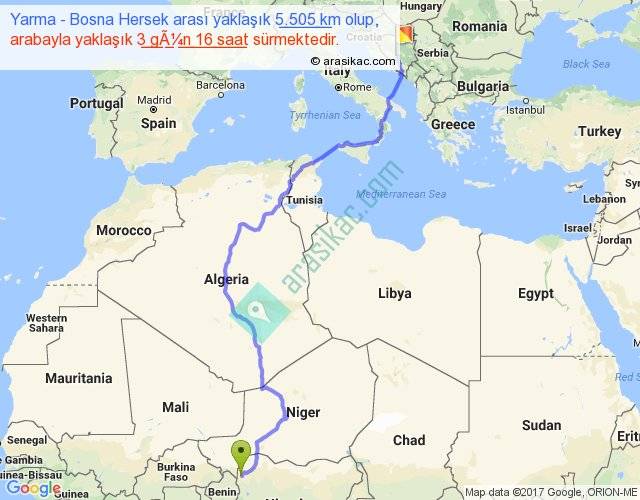 Yarma - Bosna Hersek arası yaklaşık olarak 90 km/h ile yukarıda belirtilen sürede olup, iki yerin kuş uçuşu uzaklığı (mesafesi) 3762'dir. Eğer belirtilen yerler arasında uçak seferi var ise bu süre uçakla 5 saat 47 dakika'ya kadar düşebilir. Yolculuk otobüsle 4 gün 18 saat sürmektedir.