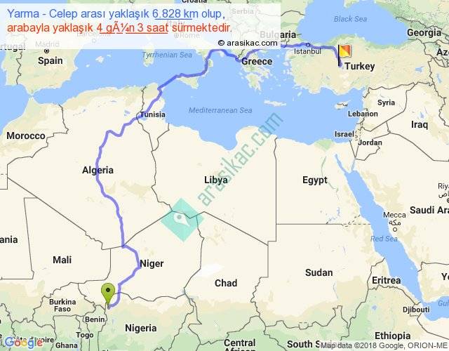 Yarma - Celep arası yaklaşık olarak 90 km/h ile yukarıda belirtilen sürede olup, iki yerin kuş uçuşu uzaklığı (mesafesi) 4116'dir. Eğer belirtilen yerler arasında uçak seferi var ise bu süre uçakla 6 saat 19 dakika'ya kadar düşebilir. Yolculuk otobüsle 5 gün 8 saat sürmektedir.