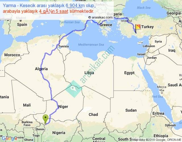 Yarma - Kesecik arası yaklaşık olarak 90 km/h ile yukarıda belirtilen sürede olup, iki yerin kuş uçuşu uzaklığı (mesafesi) 3940'dir. Eğer belirtilen yerler arasında uçak seferi var ise bu süre uçakla 6 saat 03 dakika'ya kadar düşebilir. Yolculuk otobüsle 5 gün 11 saat sürmektedir.