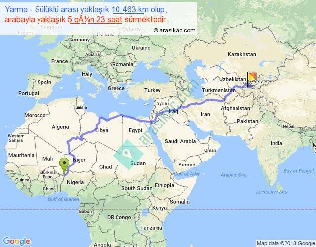 Yarma - Sülüklü arası yaklaşık olarak 90 km/h ile yukarıda belirtilen sürede olup, iki yerin kuş uçuşu uzaklığı (mesafesi) 7039'dir. Eğer belirtilen yerler arasında uçak seferi var ise bu süre uçakla 10 saat 49 dakika'ya kadar düşebilir. Yolculuk otobüsle 7 gün 17 saat sürmektedir.