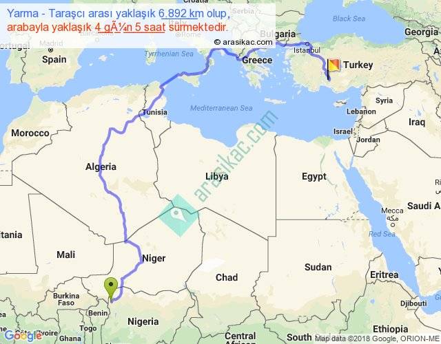 Yarma - Taraşcı arası yaklaşık olarak 90 km/h ile yukarıda belirtilen sürede olup, iki yerin kuş uçuşu uzaklığı (mesafesi) 3931'dir. Eğer belirtilen yerler arasında uçak seferi var ise bu süre uçakla 6 saat 02 dakika'ya kadar düşebilir. Yolculuk otobüsle 5 gün 11 saat sürmektedir.