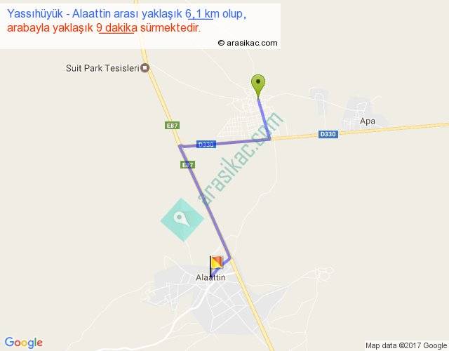 Yassıhüyük - Alaattin arası yaklaşık olarak 90 km/h ile yukarıda belirtilen sürede olup, iki yerin kuş uçuşu uzaklığı (mesafesi) 4'dir. Yolculuk otobüsle 11 dakika sürmektedir.