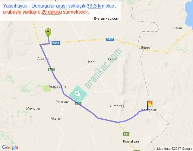 Yassıhüyük - Dodurgalar arası yaklaşık olarak 90 km/h ile yukarıda belirtilen sürede olup, iki yerin kuş uçuşu uzaklığı (mesafesi) 24'dir. Yolculuk otobüsle 37 dakika sürmektedir.