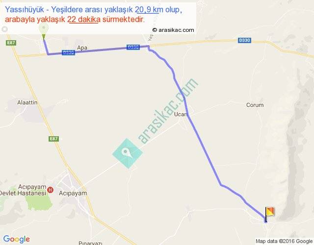 Yassıhüyük - Yeşildere arası yaklaşık olarak 90 km/h ile yukarıda belirtilen sürede olup, iki yerin kuş uçuşu uzaklığı (mesafesi) 18'dir. Yolculuk otobüsle 28 dakika sürmektedir.