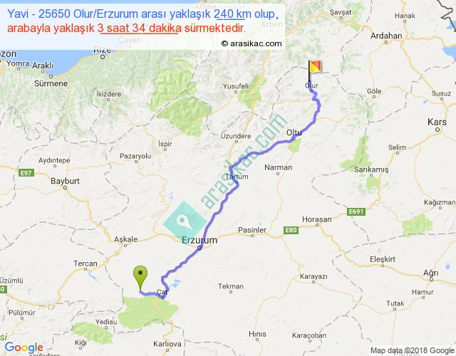 Yavi - 25650 Olur Erzurum arası yaklaşık olarak 90 km/h ile yukarıda belirtilen sürede olup, iki yerin kuş uçuşu uzaklığı (mesafesi) 176'dir. Yolculuk otobüsle 4 saat 38 dakika sürmektedir.