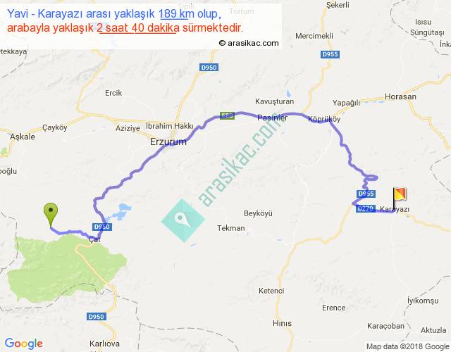 Yavi - Karayazı arası yaklaşık olarak 90 km/h ile yukarıda belirtilen sürede olup, iki yerin kuş uçuşu uzaklığı (mesafesi) 114'dir. Yolculuk otobüsle 3 saat 28 dakika sürmektedir.