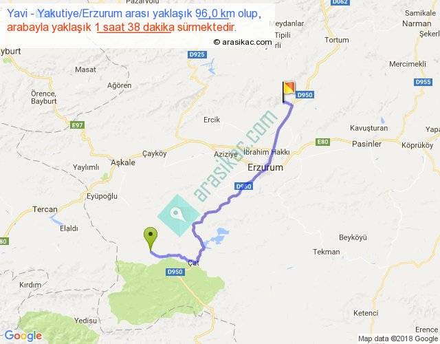 Yavi - Yakutiye Erzurum arası yaklaşık olarak 90 km/h ile yukarıda belirtilen sürede olup, iki yerin kuş uçuşu uzaklığı (mesafesi) 68'dir. Yolculuk otobüsle 2 saat 7 dakika sürmektedir.