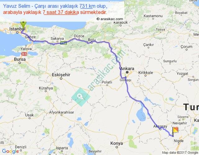 Yavuz Selim - Çarşı arası yaklaşık olarak 90 km/h ile yukarıda belirtilen sürede olup, iki yerin kuş uçuşu uzaklığı (mesafesi) 554'dir. Eğer belirtilen yerler arasında uçak seferi var ise bu süre uçakla 51 dakika'ya kadar düşebilir. Yolculuk otobüsle 9 saat 54 dakika sürmektedir.