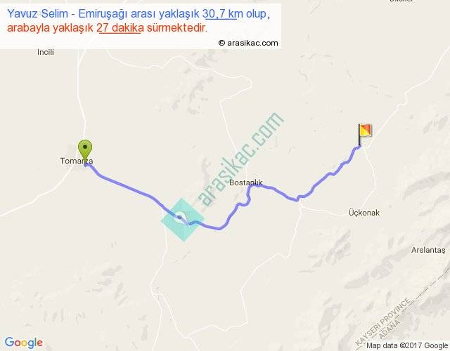 Yavuz Selim - Emiruşağı arası yaklaşık olarak 90 km/h ile yukarıda belirtilen sürede olup, iki yerin kuş uçuşu uzaklığı (mesafesi) 23'dir. Yolculuk otobüsle 35 dakika sürmektedir.