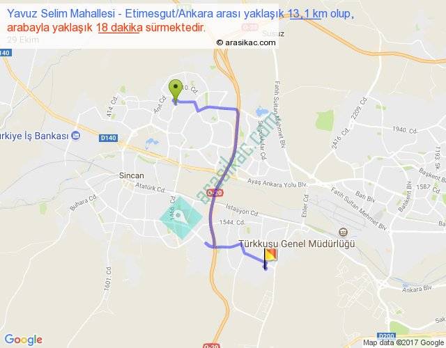 Yavuz Selim Mahallesi - Etimesgut Ankara arası yaklaşık olarak 90 km/h ile yukarıda belirtilen sürede olup, iki yerin kuş uçuşu uzaklığı (mesafesi) 8'dir. Yolculuk otobüsle 23 dakika sürmektedir.