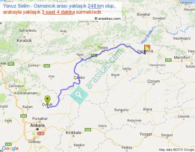 Yavuz Selim - Osmancık arası yaklaşık olarak 90 km/h ile yukarıda belirtilen sürede olup, iki yerin kuş uçuşu uzaklığı (mesafesi) 168'dir. Yolculuk otobüsle 3 saat 59 dakika sürmektedir.